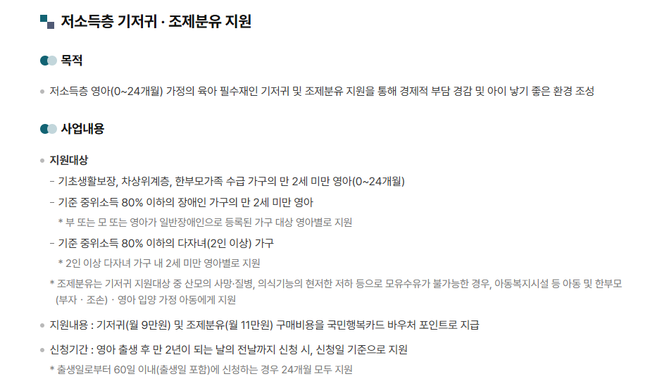 - 정식 명칭: 저소득층 기저귀·조제분유 지원사업